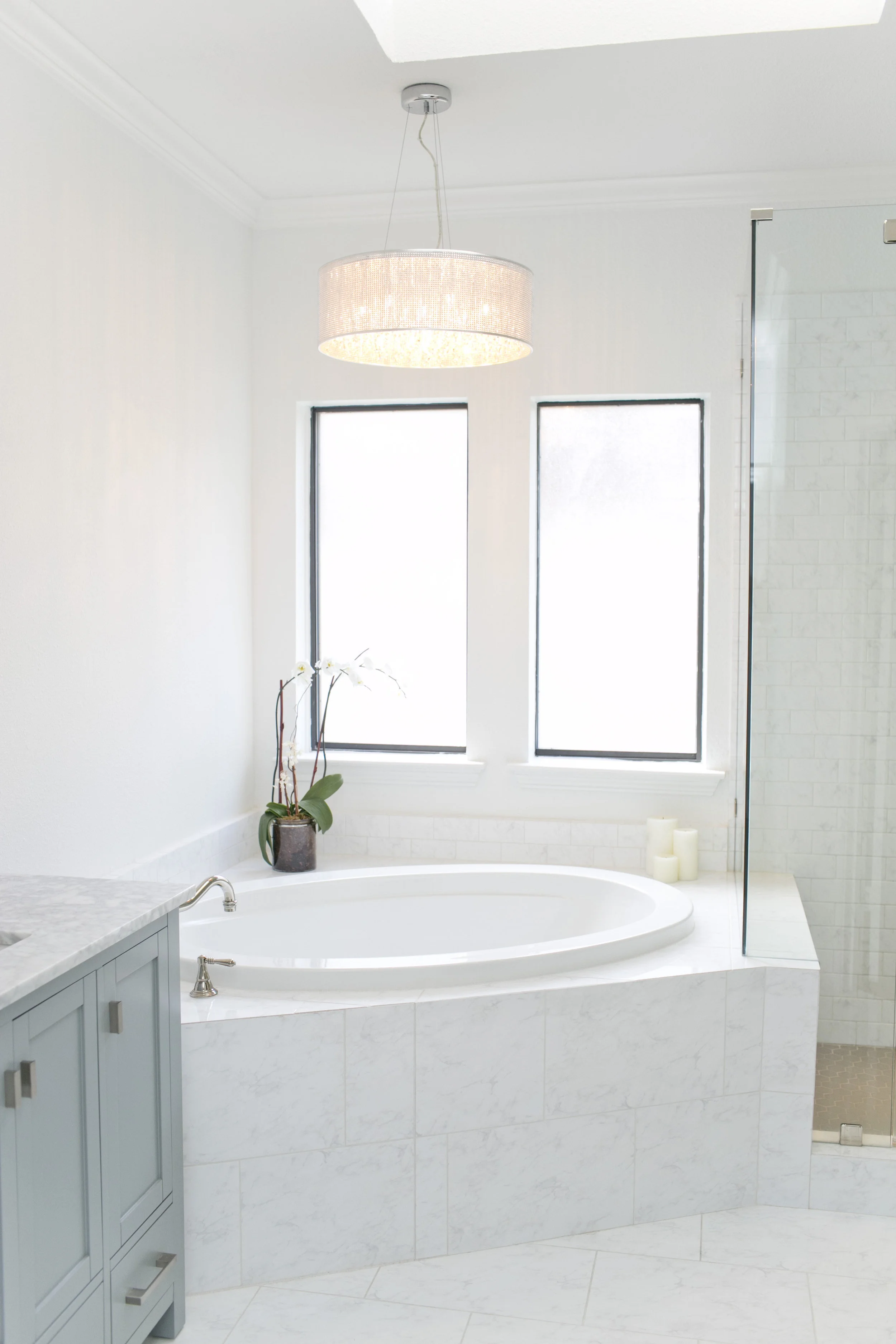 In addition to the kitchen and dining remodel, we also tackled the master bathroom. Here we did the floors in a marble 2" hexagon, a free standing vanity with a carrara marble top and Kohler Bancroft plumbing fixtures in chrome.